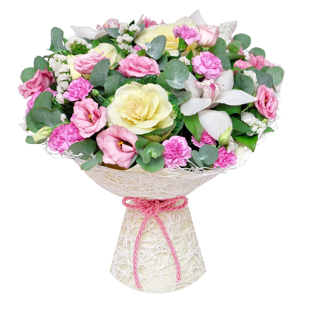 Эустома, гвоздика, орхидея, статица, роза одноголовая, эвкалипт.